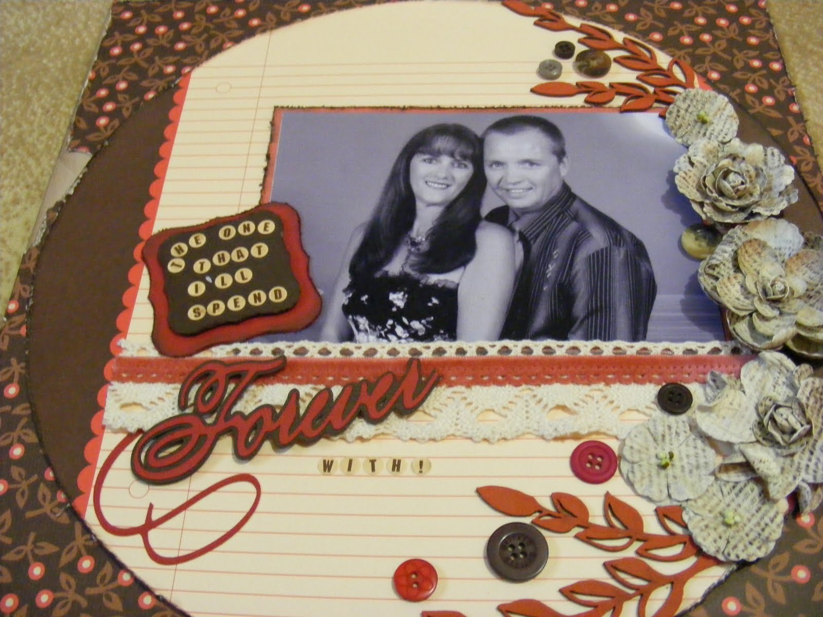 wowzers this is beautiful!! I photo of you two is fabulous... and the LO totally rocks!! I love everything about it... the circle, the title, the flowers, just everything!! Nice work!!